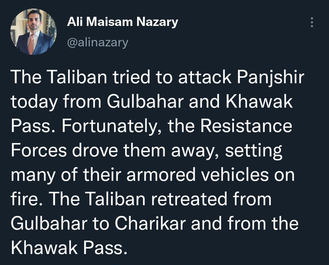 Ít giờ trước, ông Ali Maisam Nazary, Trưởng ban Đối ngoại của Mặt trận Quốc gia Kháng chiến (NRF) đăng tải lên mạng xã hội Twitter tuyên bố như sau: