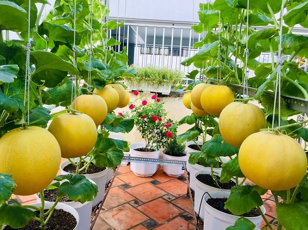 Hiện tại, khu vườn trên sân thượng của chị Ánh có khoảng 100 chậu dưa đủ loại từ dưa lưới, dưa hấu, dưa lê, dưa Kim Long… mỗi loại từ 2-3 hàng.