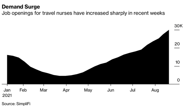 Theo số liệu từ SimpliFi - công ty cung cấp nhân sự điều dưỡng, hiện có khoảng 30.000 vị trí đang tuyển dụng cho công việc y tá du lịch. Con số này tăng khoảng 30% so với mức đỉnh của mùa đông năm ngoái và vẫn tiếp tục tăng cao hơn nữa. Mức lương của ngành này cũng tăng vọt, cao nhất là 8.000 USD/tuần cho một công việc 3 tháng.