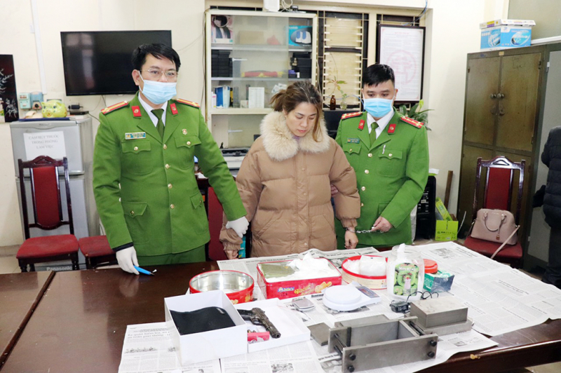 Đối tượng Trang và tang vật của vụ án thời điểm bị bắt giữ.