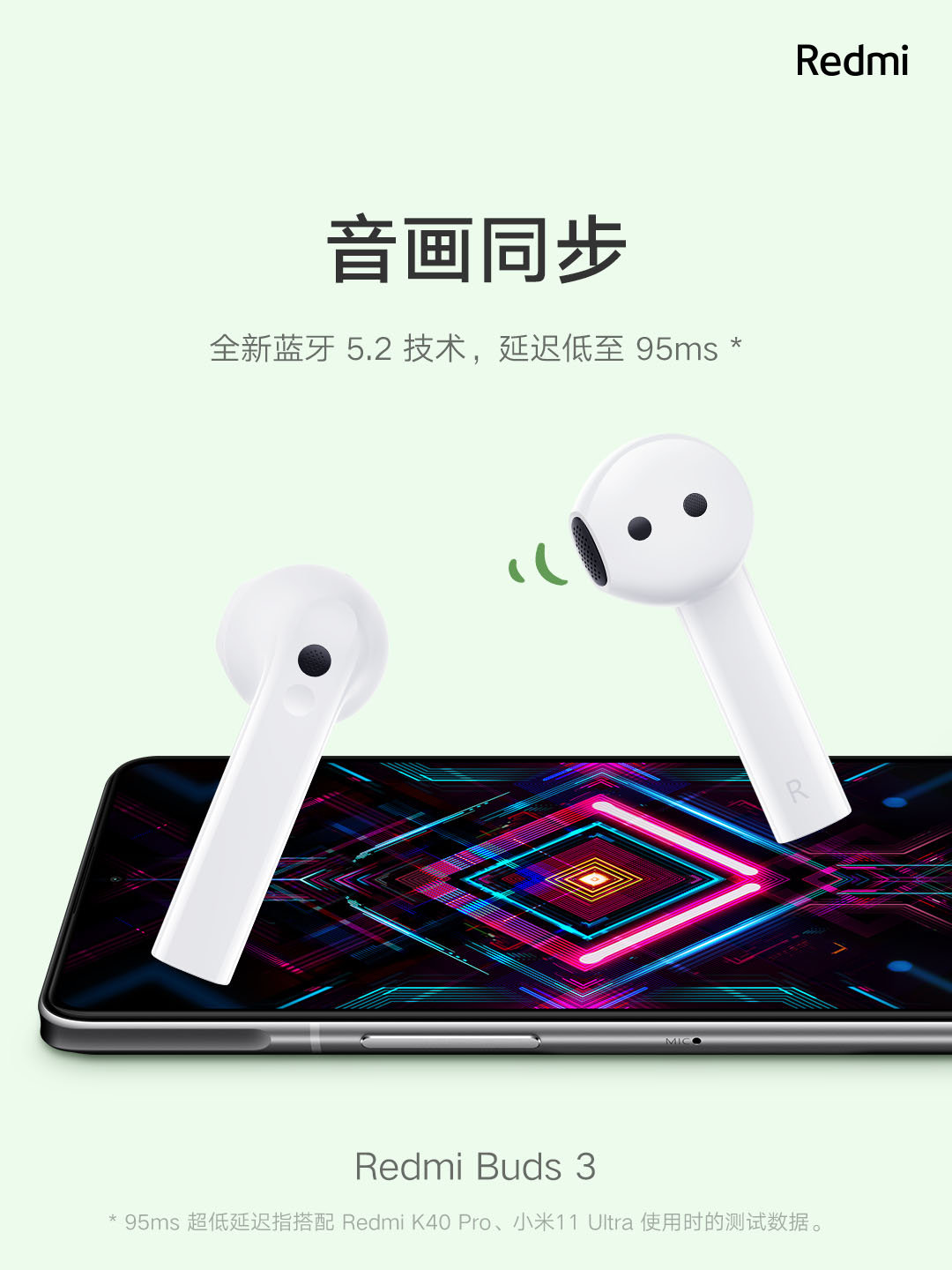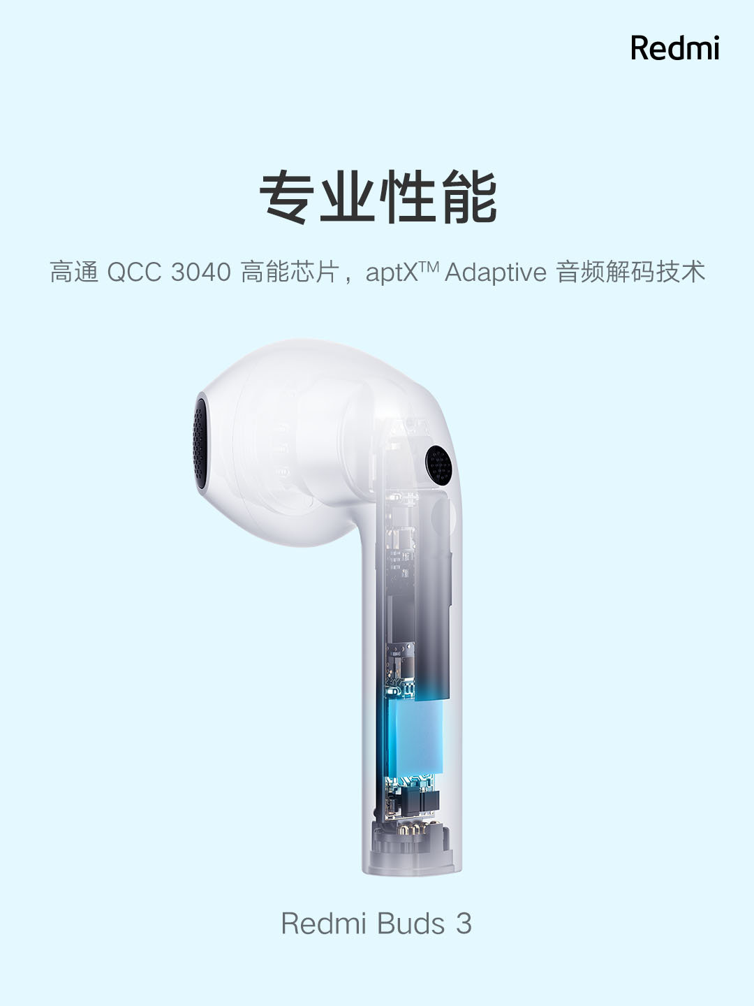 Redmi Buds 3 trang bị con chip Qualcomm QCC3040 năng lượng cao, hỗ trợ công nghệ aptX Adaptive và Bluetooth 5.2 nhằm giảm thiểu tối đa hiện tượng trễ. Theo công bố thì tai nghe có độ trễ ở mức 95ms, một con số tương đối ổn với một chiếc tai nghe không dây giá rẻ.