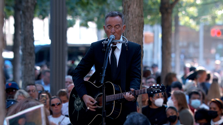 Sau phút giây mặc niệm, ca sĩ Bruce Springsteen biểu diễn bài hát "I'll See You In My Dreams". Năm 2002, ông đã phát hành album "The Rising" với nhiều bài hát phản ánh về sự kiện ngày 11/9. Ảnh: CNN