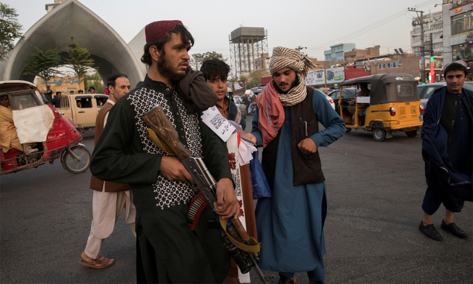 Các tay súng Taliban đi tuần trên đường phố Herat ngày 10/9. Ảnh: Reuters.