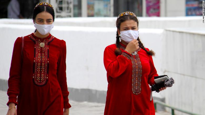 Phụ nữ Turkmenistan đeo khẩu trang đi bộ ở Ashgabat ngày 13/7/2020. Ảnh CNN.