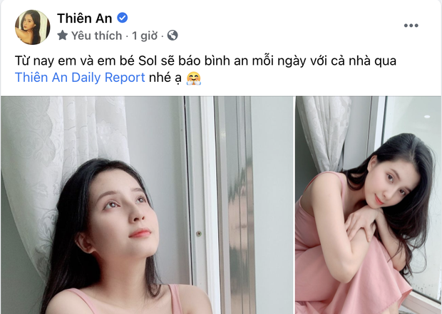Mới đây, Thiên An thông báo với mọi người về một fanpage mới mà bà mẹ bỉm sữa dùng để đăng ảnh mình và con gái cưng. Thiên An viết: Từ nay em và em bé Sol sẽ báo bình an mỗi ngày với cả nhà qua Thiên An Daily Report nhé ạ.
