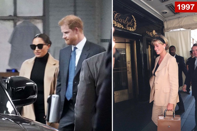 Vợ chồng Meghan rời khách sạn Carlyle ở New York chiều 23/9 (trái) và Diana đến khách sạn này năm 1997 (phải). Ảnh: Backgrid/Tim Rooker