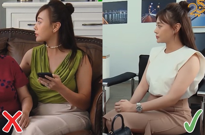Phương Oanh bị nhiều khán giả chê kém thon khi mặc áo không tay, thắt nơ cầu kỳ ở eo. Trong một tập phim khác, diễn viên 'Hương vị tình thân' nữ tính, gọn gàng hơn nhờ phối áo lửng tay bồng cùng chân váy nhẹ nhàng. Set váy ren đứng phom cũng phù hợp với vóc dáng hơn là kiểu trang phục quá mềm, nhiều chi tiết.