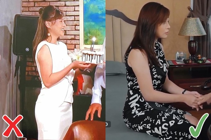 Chuộng phong cách công sở sang trọng và thanh lịch, Phương Oanh diện nhiều kiểu chân váy ôm trong phim. Những phân cảnh ở góc nghiêng, diễn viên lộ dáng chưa thon gọn. Với cách kết hợp áo cắm thùng cùng chân váy, chị em nên chọn những kiểu chân váy không quá bó ở eo, có độ xòe nhẹ nhàng để che đi nhược điểm.