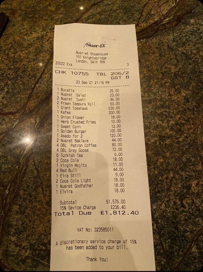 Một bữa tối đơn giản trong nhà hàng của đầu bếp nổi tiếng Salt Bae có giá bằng một cặp vé máy bay khứ hồi Anh - Thổ Nhĩ Kỳ.