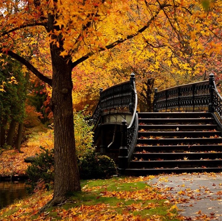 Sắc vàng phủ ngập khu rừng làm tăng thêm sự ma mị của cây cầu gỗ.