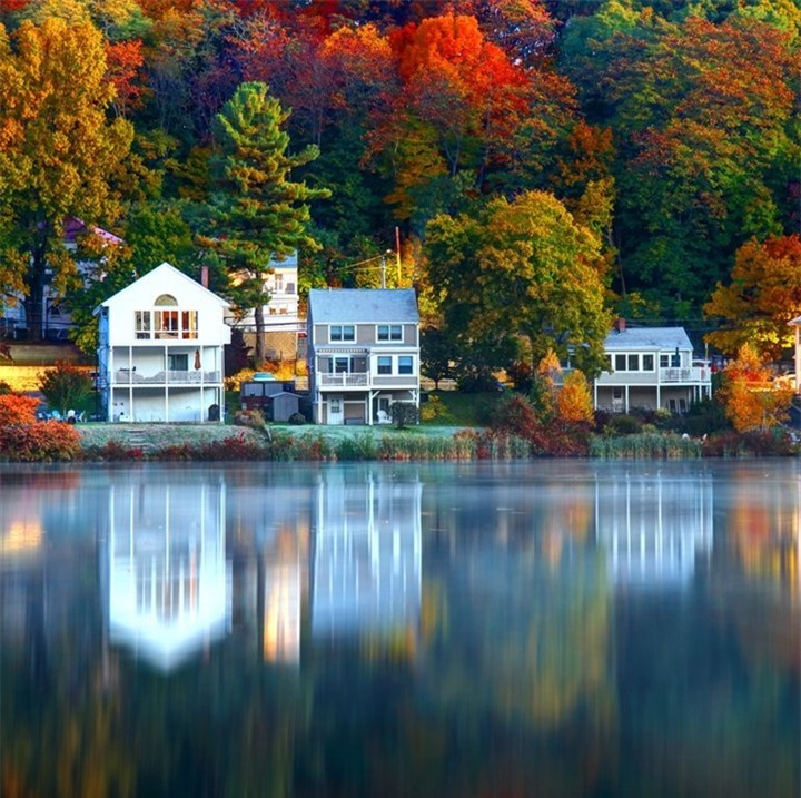 Hồ nước in bóng những căn nhà và hàng cây chuyển sắc đỏ. (Ảnh: DENISTANGNEYJR/GETTY IMAGES)