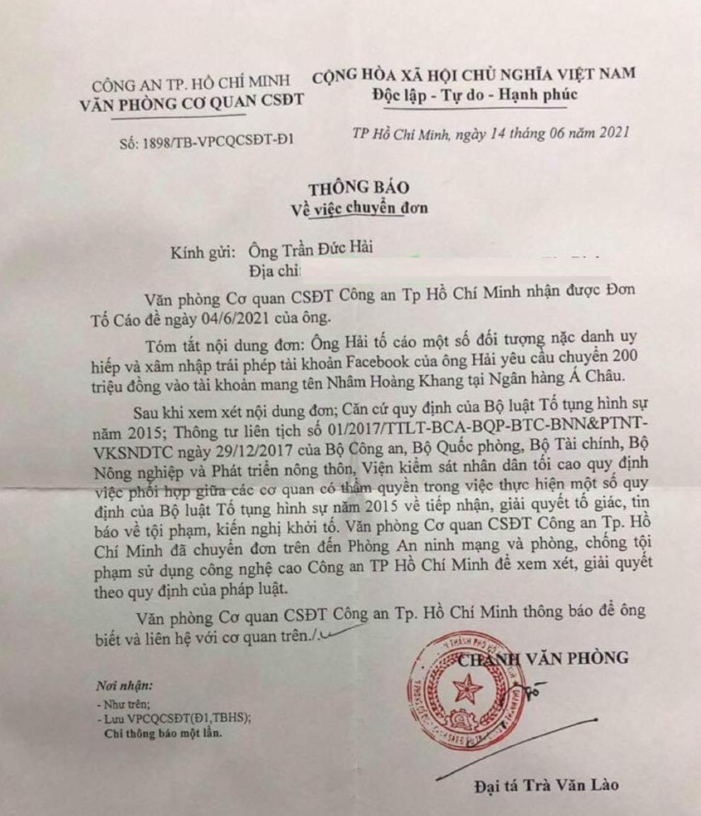 Đồng thời, phía Cơ quan Cảnh sát điều tra cũng cho biết đã nhận được đơn tố cáo của nghệ sĩ Đức Hải và chuyển đơn đến Phòng An ninh mạng và phòng, chống tội phạm sử dụng công nghệ cao, Công an TP.HCM để xem xét, giải quyết theo quy định của pháp luật.