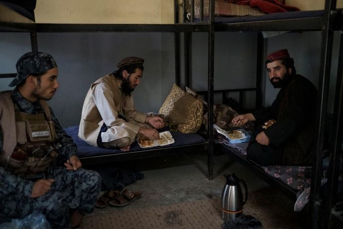 Các chiến binh Taliban ăn trưa tại một đồn cảnh sát. Ảnh: AP