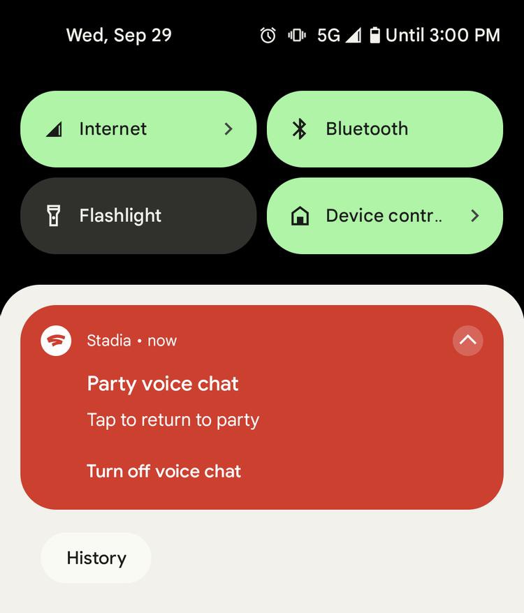 Trong trò chuyện nhóm, Stadia sẽ đặt một thông báo có nhãn "Party voice chat" tại khay thông báo của hệ thống, kèm theo các liên kết đơn giản để quay lại chế độ xem nhóm và tắt tiếng micro. Đối với trò chuyện thoại, bạn sẽ thấy một cửa sổ bật lên trong ứng dụng thông báo tai nghe đã được kết nối.