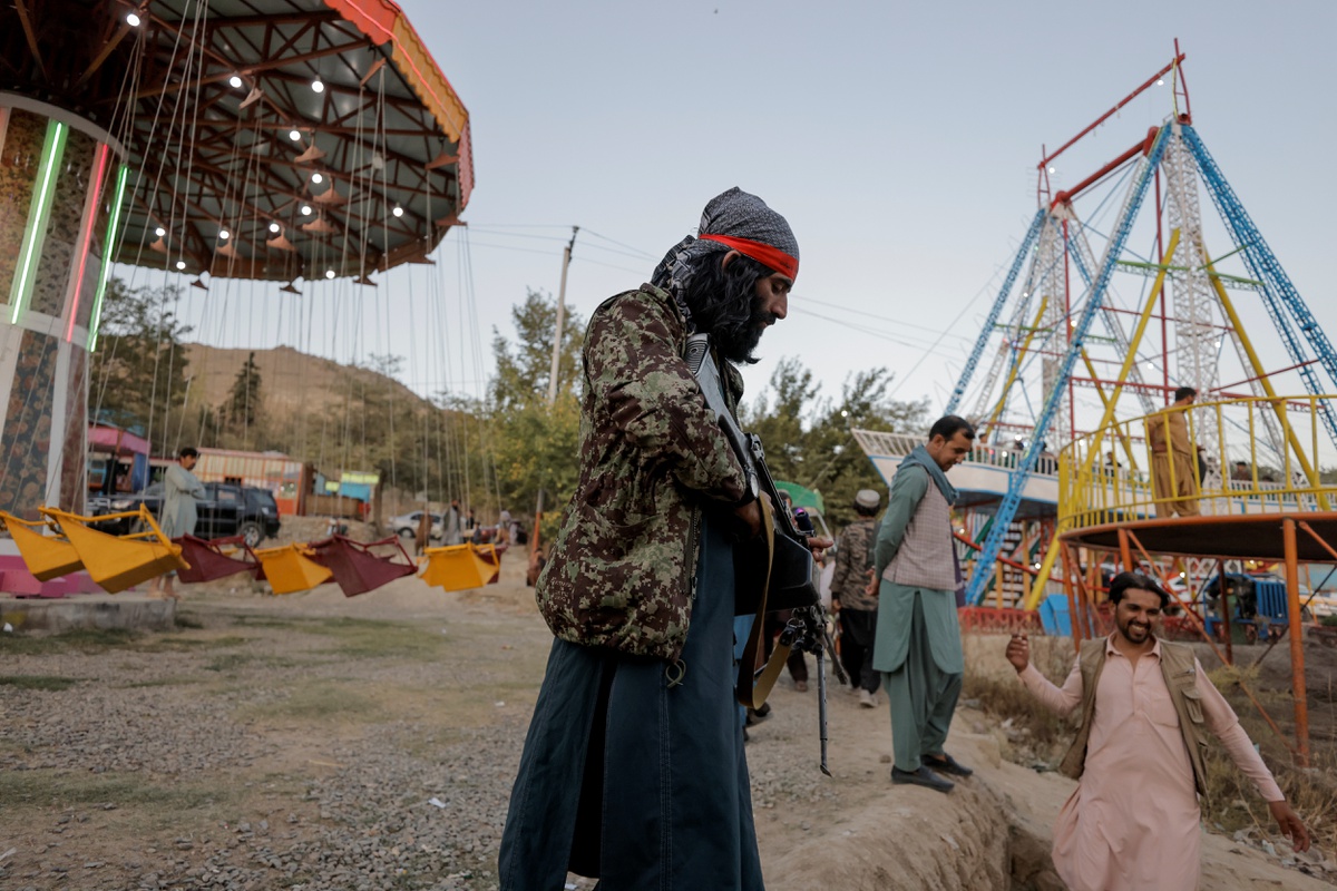 Các tay súng của tổ chức Taliban đã đến chơi tại một công viên giải trí ở thủ đô Kabul trong ngày 8/10, khi nhóm này có một ngày nghỉ hiếm hoi, theo Reuters. Trong ảnh, các tay súng Taliban tới công viên giải trí nhưng vẫn luôn mang súng bên mình. Ảnh: Reuters.