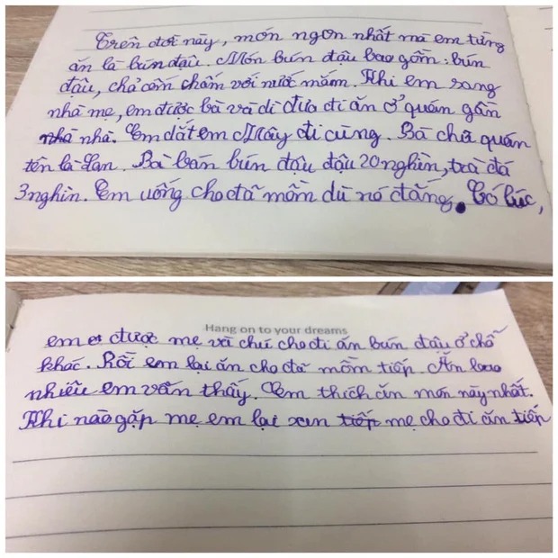 Cụ thể, cậu bé đã miêu tả món bún đậu như sau: “Trên đời này, món ngon nhất mà em từng ăn là bún đậu. Món bún đậu bao gồm: bún, đậu, chả cốm chấm với nước mắm. Khi em sang nhà mẹ, em được bà và dì đưa đi ăn ở quán gần nhà.