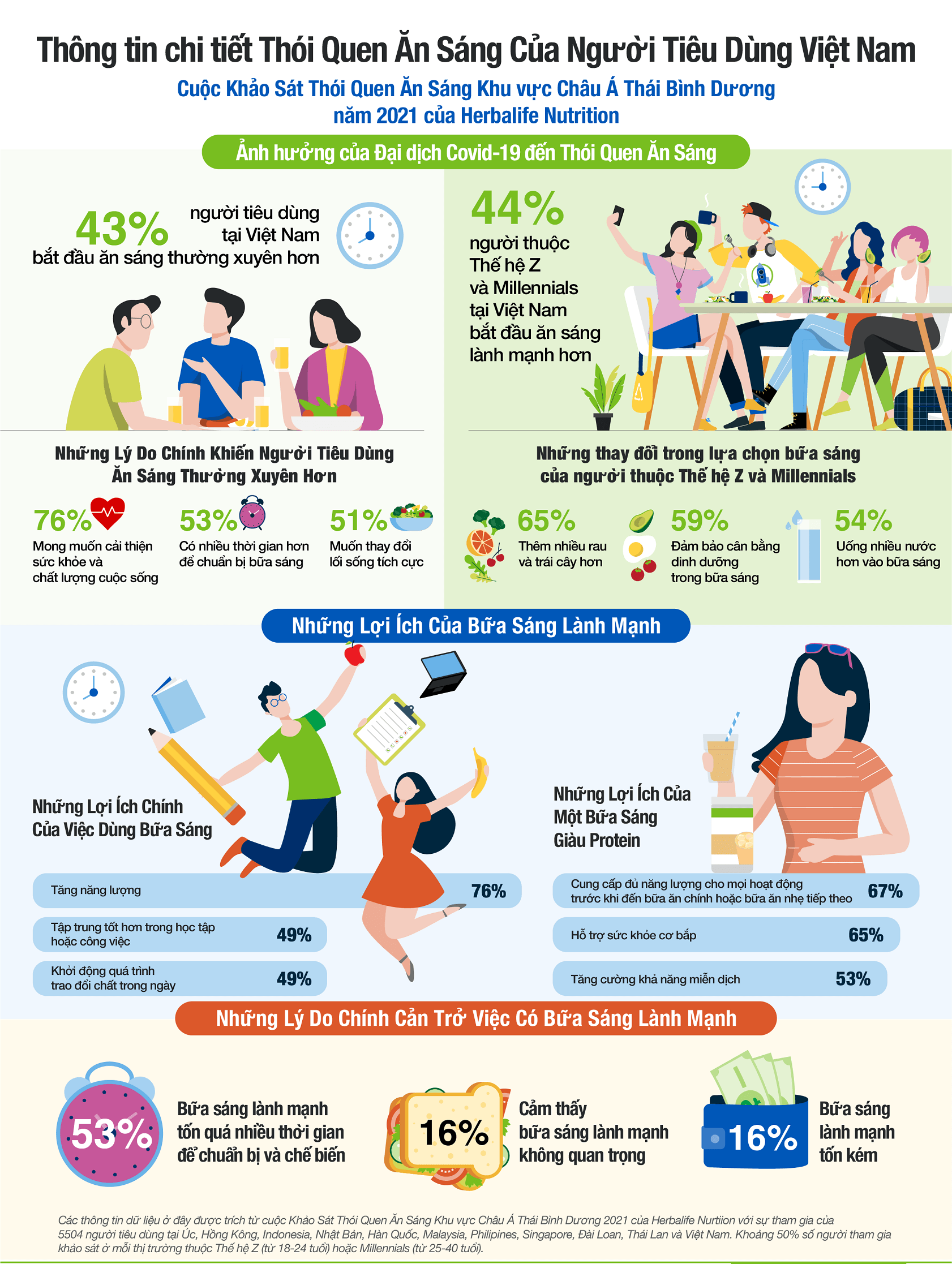 Để hiểu được ảnh hưởng của đại dịch hiện nay đối với thái độ và thói quen ăn sáng của người tiêu dùng khu vực châu Á - Thái Bình Dương cũng như sở thích của các nhóm nhân khẩu học khác nhau, Herbalife Nutrition đã tiến hành thăm dò ý kiến ​​của hơn 5.500 người tham gia khảo sát trong độ tuổi từ 18 tuổi trở lên tại 11 thị trường: Úc, Hồng Kông, Indonesia, Nhật Bản, Hàn Quốc, Malaysia, Philippines, Singapore, Đài Loan, Thái Lan và Việt Nam.