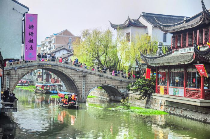 Cách thành phố khoảng 30 phút đi tàu điện ngầm, Qibao là một trong những thành phố nhỏ của Trung Quốc. Nơi đây được mệnh danh là một thị trấn nước. Khu vực này được cắt ngang bởi hai làn nước với dày đặc các con đường thủy, giúp khách hàng có thể tham quan và di chuyển ngay trên sông. Cùng với đó là những ngôi nhà truyền thống, ngôi đền, cửa hàng mang đậm phong cách nơi đây.