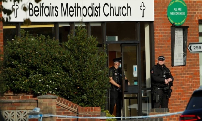 Cảnh sát có mặt tại hiện trường vụ đâm dao ở Nhà thờ Giám lý Belfairs thuộc thị trấn Leigh-on-Sea, vùng Essex, ngày 15/10. Ảnh: Reuters.
