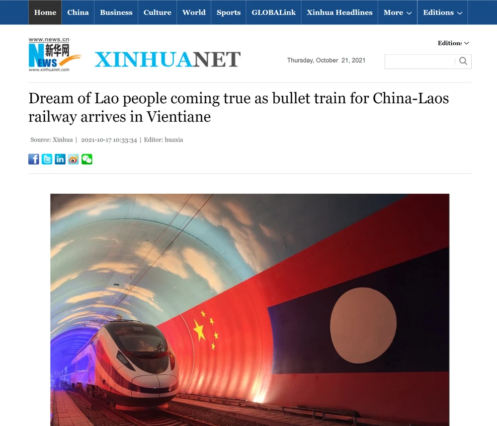 Báo Tân Hoa Xã (Trung Quốc) ngày 16/10 đưa tin: Giấc mơ của người dân Lào về việc đưa đất nước không giáp biển này trở thành một trung tâm tâm liên kết trên đất liền đang trở thành hiện thực khi nước này tiếp nhận tàu cao tốc "chuẩn Trung Quốc" tại thủ đô Vientiane cuối tuần trước.