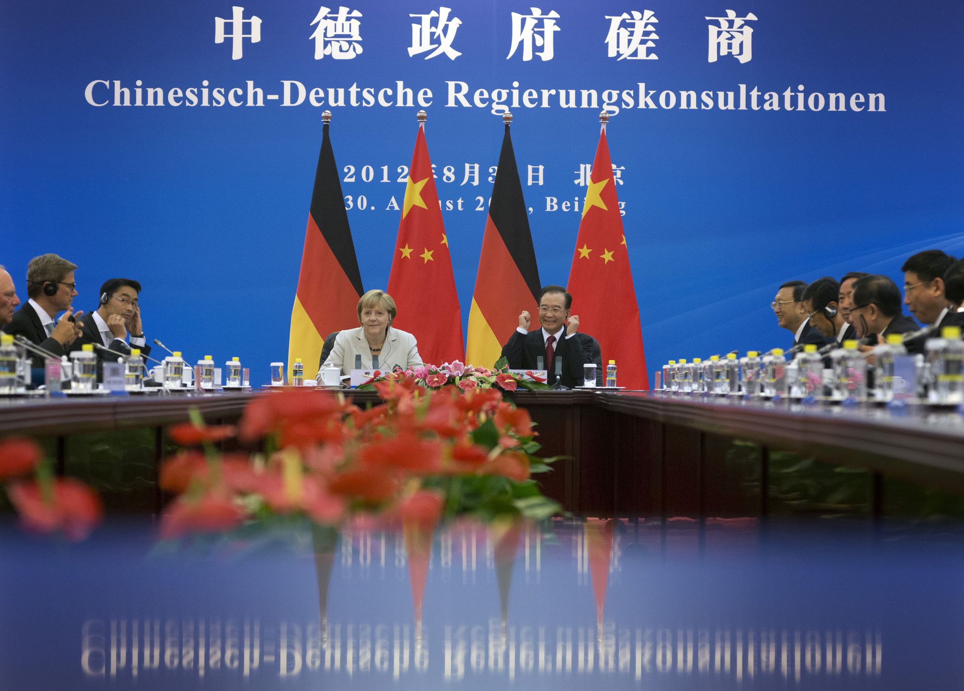 Ngày 30/8/2012, Merkel và Ôn Gia Bảo đồng chủ trì vòng tham vấn chính phủ Trung - Đức lần thứ hai tại Bắc Kinh. Ảnh: Getty