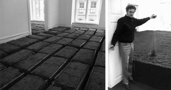Walter De Maria (phải) tạo nên phòng Trái đất đầu tiên tại Munich, Đức năm 1968. Ảnh: LA Times