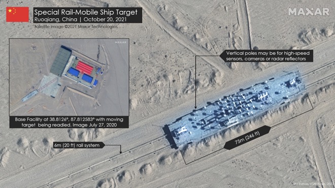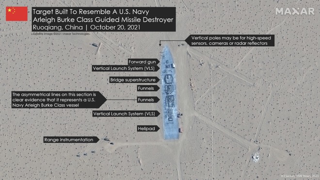 Hãng Maxar ngày 7.11 công bố ảnh vệ tinh cho thấy vật thể giống tàu sân bay hạt nhân Mỹ và ít nhất hai tàu khu trục lớp Arleigh Burke tại sa mạc Taklamakan, khu tự trị Tân Cương. Maxar cho biết, đây là các mục tiêu do Trung Quốc xây dựng để tập bắn.