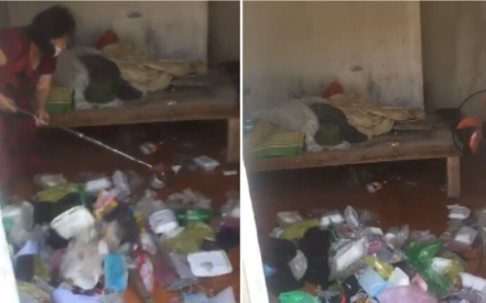 Trong đoạn clip, 2 người phụ nữ lớn tuổi phải xắn tay dọn đống rác thải này. Trong căn phòng, rác từ trên giường xuống đến dưới sàn. Vừa quét rác ra khỏi phòng, người phụ nữ vừa tỏ ra vô cùng ngán ngẩm trước căn phòng của chàng trai.