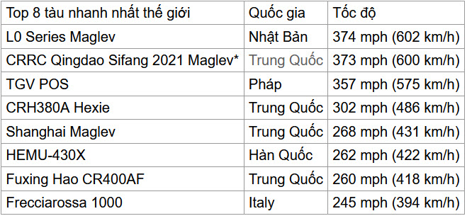 Ngày nay, cuộc đua phát triển tàu tốc độ cao của các quốc gia trên thế giới vẫn rất "nóng", Nhật Bản đã có một đối thủ rất đáng gờm. Sau đây là bảng xếp hạng 8 con tàu tốc độ cao nhất thế giới do tạp chí Du lịch và Giải trí tổng hợp.