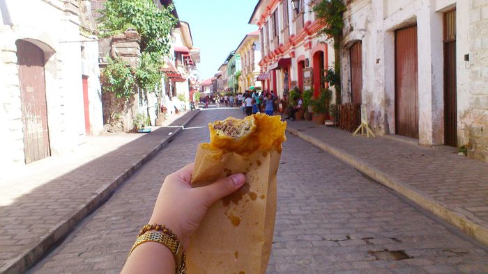 Đến Vigan, du khách cũng có thể thực hiện chuyến du lịch ẩm thực với việc thưởng thức hương vị của những món ăn đặc trưng như pizza pinakbet ở quán cafe Leona, sinanglaw (súp ruột) tại quảng trường Burgos, bánh empanada tại nhà hàng Irene's Vigan, bì lợn ở nhà hàng Lilong and Lilang, Paella Ilocandia (cơm rang thập cẩm) tại quán cafe Bigaa... Ảnh: Red Maleta.
