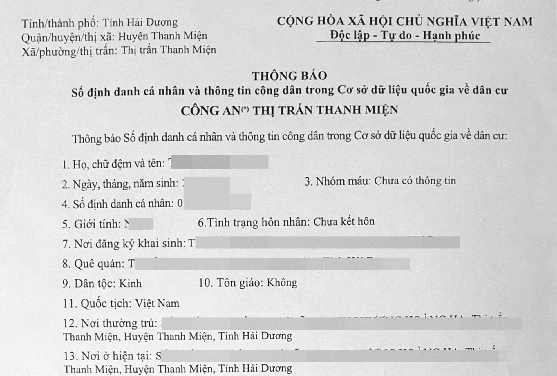 Bài báo dẫn trường hợp của bà TNTT ở quận Tân Bình, Sài Gòn, phải đến công an phường xin tờ "Thông báo số định danh cá nhân và thông tin công dân trong cơ sở dữ liệu quốc gia về dân cư" để làm thủ tục công chứng giao dịch mua bán, do sổ hộ khẩu của bà bị thu hồi trước đó.