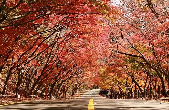 Điểm đến có mùa thay lá nổi tiếng khác ở châu Á là xứ sở kim chi. Mùa thu Hàn Quốc rơi vào các tháng 9, 10, 11. Trong đó, thời gian cao điểm để ngắm sự chuyển giao đất trời chỉ kéo dài 2 tuần. Với thời tiết mát mẻ và trong trẻo, những tán lá mùa thu tuyệt đẹp phủ khắp công viên quốc gia Naejangsan. Đến đây, du khách sẽ dạo bước trên con đường dài rợp bóng cây phong. Hai hàng cây nằm dọc bên đường với những tán lá đỏ dày đặc, đan vào nhau, tạo thành cổng vòm lãng mạn.
