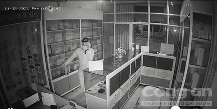 Cửa sắt có dấu hiệu bị phá, cửa kính vỡ tan hoang. Trích xuất camera an ninh, ông chủ phát hiện ra vào khoảng hơn 1 rưỡi sáng, một người đàn ông lạ đội nón bảo hiểm, đeo khẩu trang, điều khiển xe máy tới trước cửa hàng.