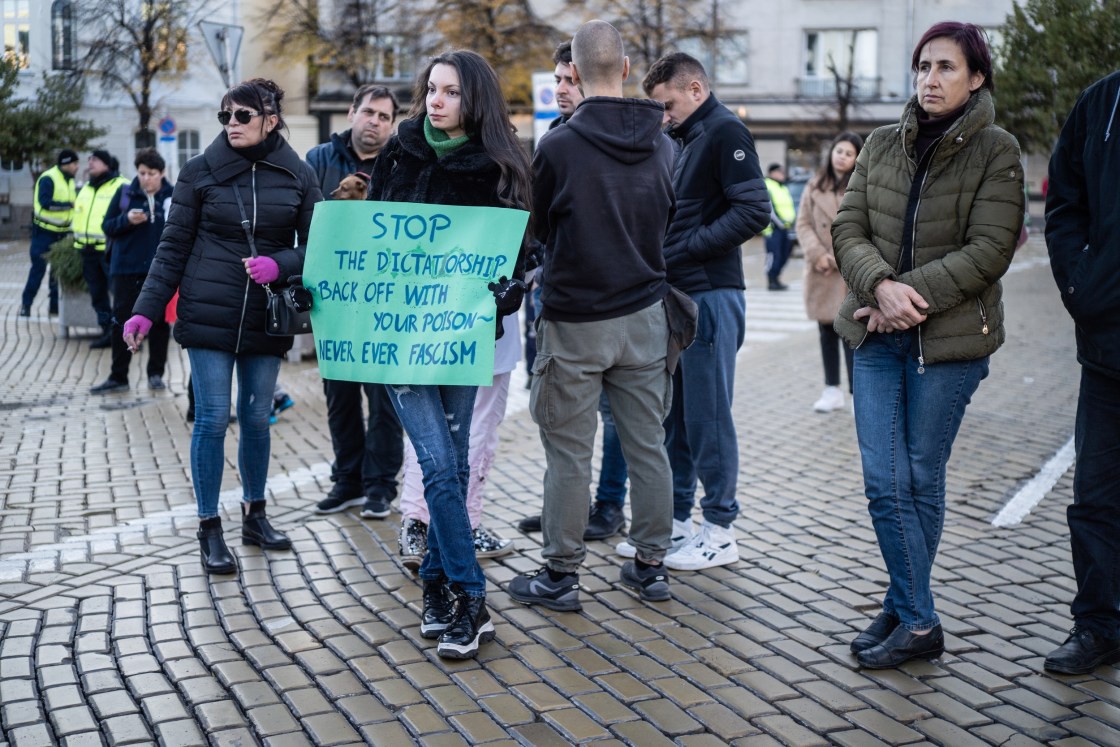 Một người phụ nữ giơ biển biểu tình chống vaccine ở Sofia, Bỉ hồi tháng 10. Ảnh: Hristo Rusev/Getty Images.