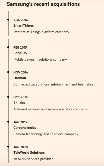 Thương vụ thâu tóm đáng kể nhất của Samsung được thực hiện lần cuối vào năm 2016 với việc mua lại tập đoàn công nghệ ô tô Harman của Mỹ trị giá 8 tỷ USD. Kể từ đó, công ty này đã gần như đứng ngoài cuộc bùng nổ các giao dịch lớn trong ngành công nghệ.