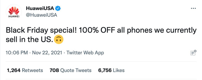 Nhân dịp Black Friday, trang Twitter chính thức của Huawei tại Hoa Kỳ đã đăng tải bài đăng cho biết công ty sẽ giảm giá (sale off) 100% các mặt hàng hiện đang bán tại nước này. Nhiều người đã cho rằng đây là một "món hời" khi có thể mua điện thoại Huawei, máy tính bảng hay các món phụ kiện khác của Huawei với giá 0 đồng, thế nhưng hoá ra đây lại chỉ là một trò đùa không hơn không kém.