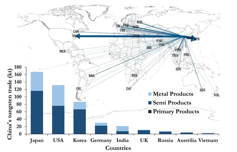 Trung Quốc là nước xuất khẩu ròng các sản phẩm vonfram từ năm 1980 đến năm 2017 và đã xuất khẩu khoảng 35% vonfram sang các nước khác. Xuất khẩu vonfram của Trung Quốc được vận chuyển đến gần 200 quốc gia khác nhau, hầu hết là các nước có nền kinh tế phát triển. Tính đến năm 2020, Nhật Bản là nhà nhập khẩu lớn nhất (167 nghìn tấn), tiếp theo là Mỹ (131 nghìn tấn) và Hàn Quốc (86 nghìn tấn).