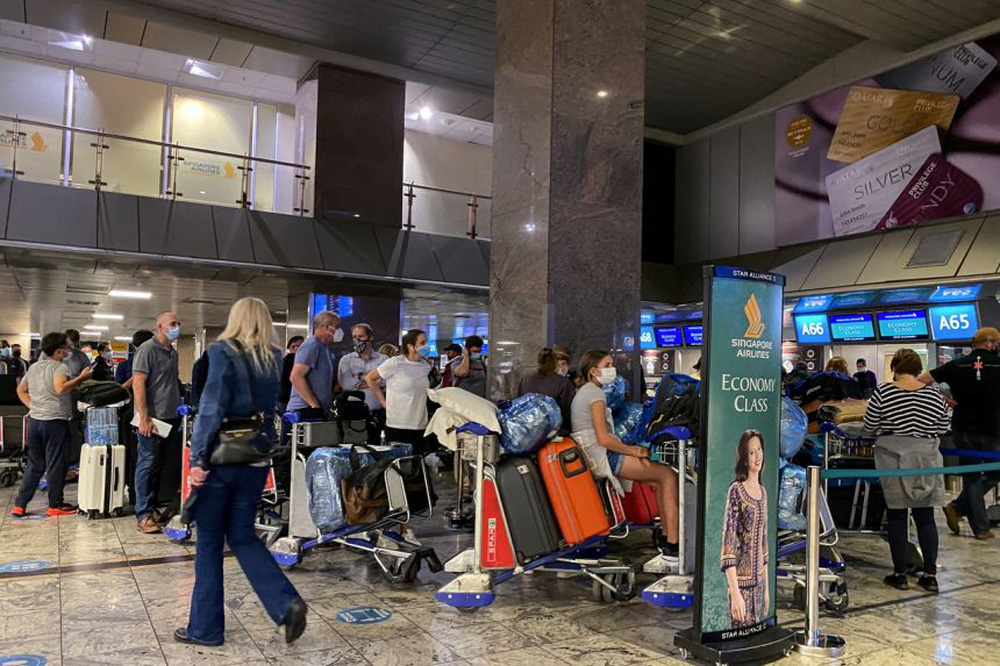 Du khách xếp hàng dài ở sân bay Quốc tế O.R. Tambo ở Johannesburg, Nam Phi chờ "tháo chạy". Ảnh: Reuters