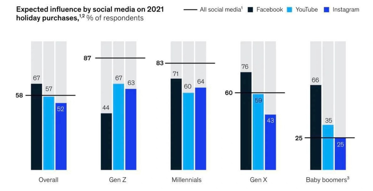 Nhiều người tiêu dùng tìm cảm hứng cho kỳ nghỉ đang trên các nền tảng xã hội. 58% người dân được hỏi nói rằng mạng xã hội sẽ ảnh hưởng đến quyết định mua sắm trong kỳ nghỉ của họ và các nền tảng đang ảnh hưởng nhiều nhất đến hành vi tiêu dùng của hộ là Facebook (67%), YouTube (57%) và Instagram (52 %). Trong đó, 87% gen Z nói rằng Instagram và TikTok là những nguồn cảm hứng lớn cho việc mua sắm dịp lễ hội của họ.
