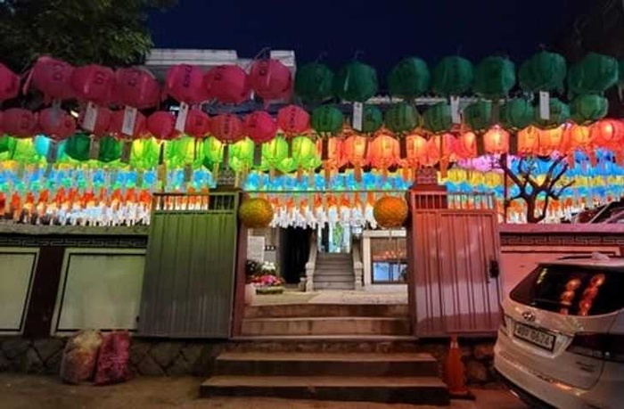 7. Một ngôi chùa nhỏ treo đèn lồng lung linh.