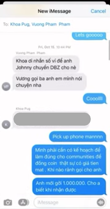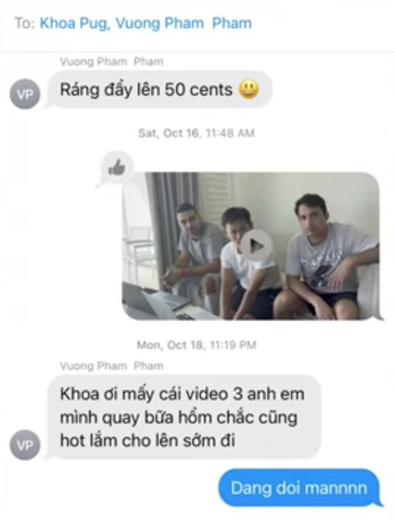Theo nội dung trong những tin nhắn này, người nói chuyện chủ yếu với Johnny Đặng là Vương Phạm. Thậm chí triệu phú đô la này còn hối Khoa Pug đăng clip để thu hút sự chú ý của mọi người: "Khoa ơi mấy cái video 3 anh em mình quay bữa hổm (hôm trước - PV) chắc cũng hot lắm. Cho lên sớm đi".