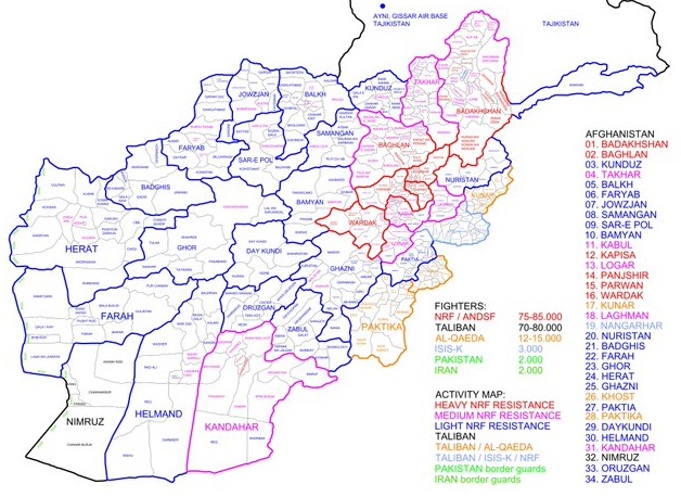 Một bản đồ mới nhất miêu tả các khu vực hoạt động theo cấp độ của NRF ở Afghanistan và căn cứ hậu cần ở Tajikistan.
