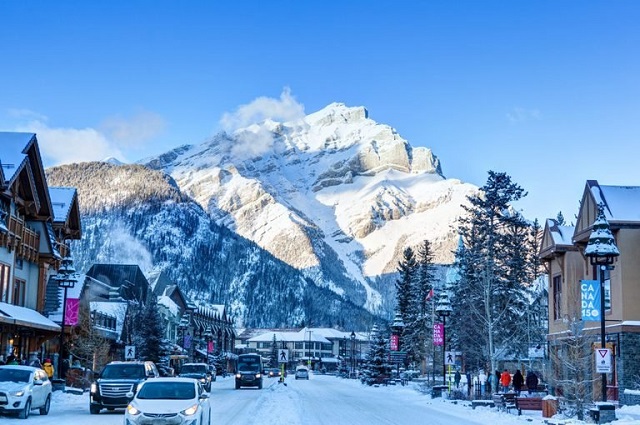 Thị trấn Banff ở Alberta là một trong những địa điểm đẹp nhất ở Canada. Nằm dưới chân núi Cascade hùng vĩ, đại lộ chính của thị trấn là một trong những nơi lý tưởng để tản bộ khi tuyết rơi. Du khách cũng có thể ghé vào các cửa hàng hoặc phòng trưng bày hai bên đường để sưởi ấm.