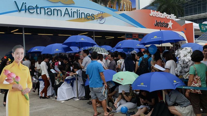 Nhiều người xếp hàng mua vé máy bay Vietnam Airlines trong một dịp giảm giá hồi tháng 4/2016