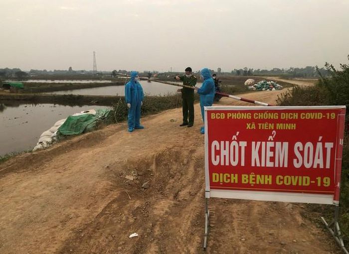 Chốt kiểm soát dịch Covid-19 đặt tại thôn Phương Đôi, xã Tiên Minh.