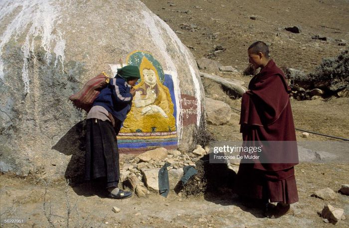 Một nhà sư và tín đồ cầu nguyện trước tảng đá vẽ hình Phật ở tu viện Pabonka, ngoại vi Lhasa, Tây Tạng năm 1991. Ảnh: Francoise De Mulder/ Getty Images.