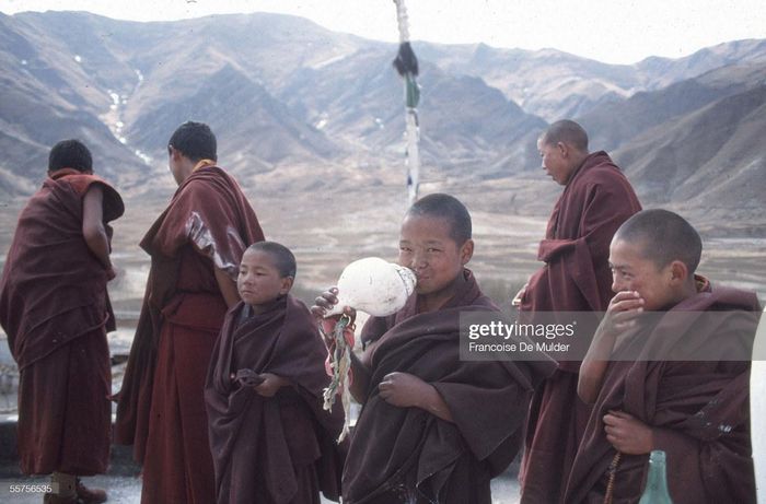 Chú tiểu ở chùa Rato cầm chiếc dung-dkar (tù và vỏ ốc), một nhạc cụ dùng trong nghi lễ tôn giáo ở Tây Tạng.