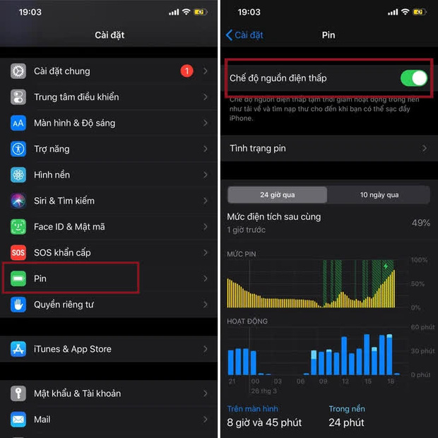 Vào Cài đặt chọn Pin => bật Chế độ nguồn điện thấp
