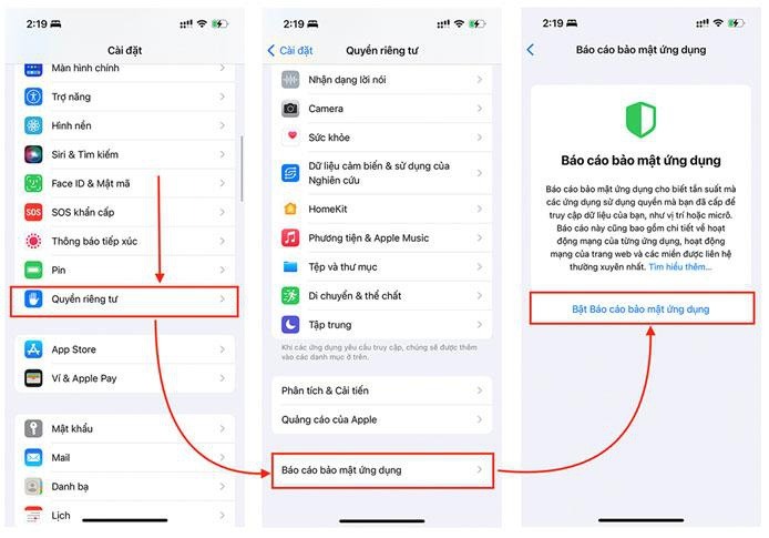 Sau khi nâng cấp thành công lên iOS 15.2, bạn hãy truy cập vào Cài đặt > Quyền riêng tư > Báo cáo bảo mật ứng dụng, sau đó nhấp chọn Bật Báo cáo bảo mật ứng dụng để kích hoạt tính năng này.