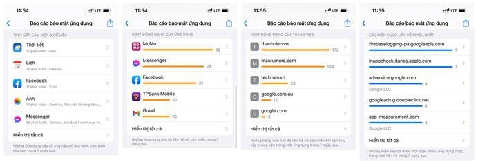 Tất cả hành vi khai thác của các ứng dụng về quyền riêng tư sẽ được ghi lại và lập thành báo cáo chi tiết trong Báo cáo bảo mật ứng dụng. Cụ thể, báo cáo được chia làm 4 mục khác nhau:
